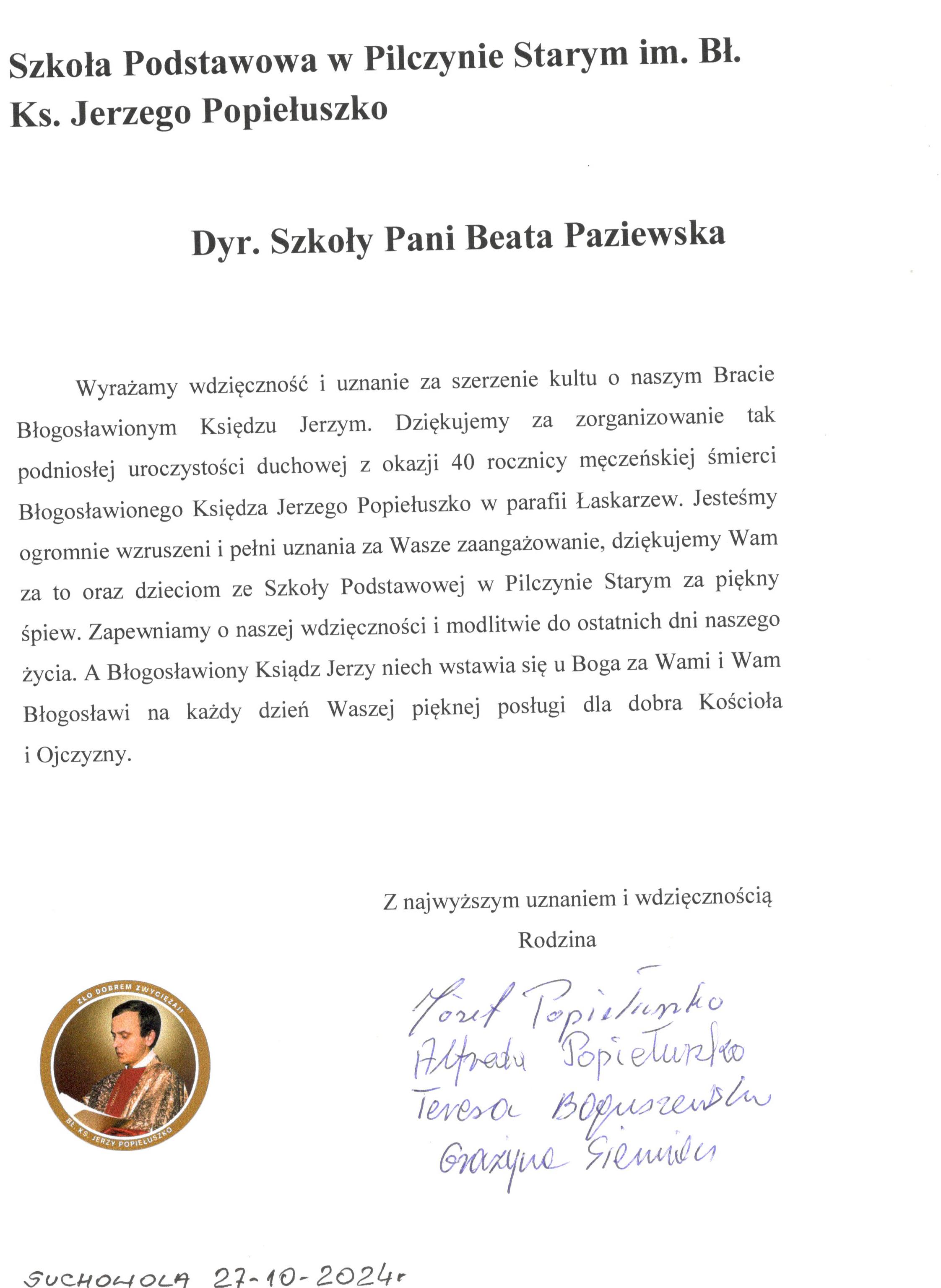 List od rodziny Popiełuszków