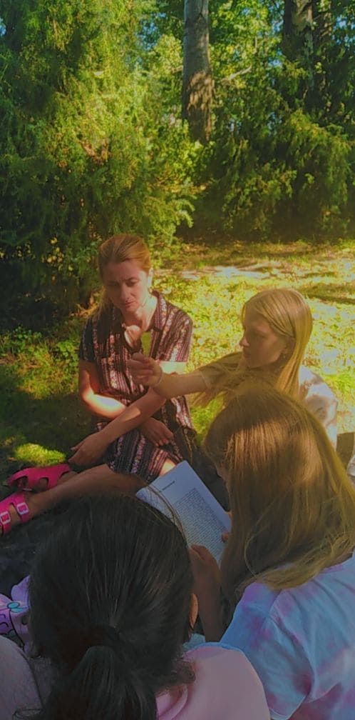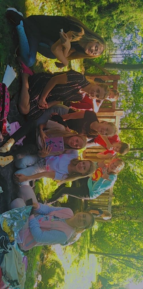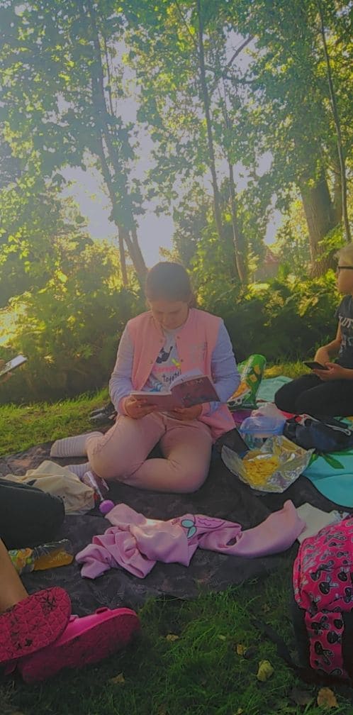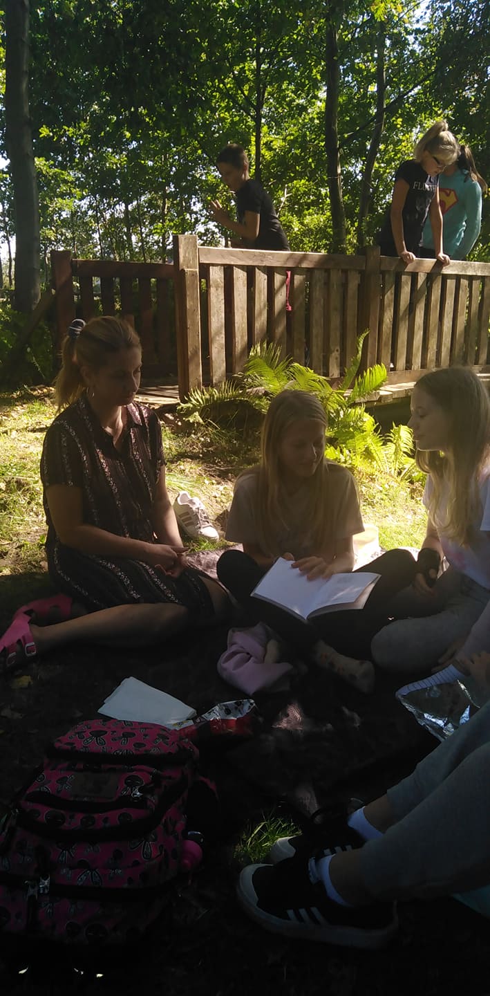 Nowy rok szkolny 2021/2022 przywitał nas słoneczną pogodą, dlatego postanowiliśmy wykorzystać sprzyjającą aurę i 10 września całą klasą wyszliśmy poza mury szkoły. Naszym celem było miło spędzić czas na łonie natury we własnym gronie. Wspólne ognisko sprzyjało integracji, rozmowom, których brakowało nam podczas zdalnego nauczania. To była również nietypowa lekcja języka polskiego, gdyż na wycieczkę zabraliśmy ze sobą opowiadania Stanisława Lema. Czytając je, przenieśliśmy się w świat robotów, jakże odmienny od tego, który nas otaczał: szum rzeczki, śpiew ptaków. Dobrze, że to była tylko fikcja!